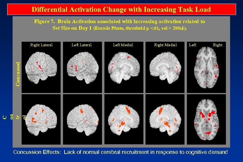 Differential Activation Change with Increasing Task Load Figure 7. Brain Activation associated with increasing activation related to Set Size on Day 1 (Encode Phase, threshold p <. 01, vol > 200 ul). Left Lateral Left Medial Right Medial Left Right C on tr ol Concussed Right Lateral Concussion Effects: Lack of normal cerebral recruitment in response to cognitive demand