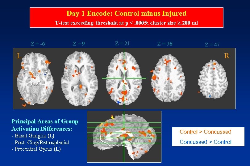 Day 1 Encode: Control minus Injured T-test exceeding threshold at p <. 0005; cluster size > 200 ml Z = -6 Z = 9 L Principal Areas of Group Activation Differences: - Basal Ganglia (L) - Post. Cing/Retrosplenial - Precentral Gyrus (L) Z = 21 Z = 36 Z = 47 R • Control > Concussed • Concussed > Control