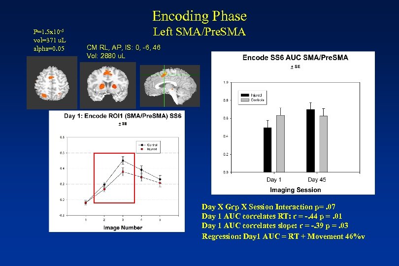 Encoding Phase P=1. 5 x 10 -5 vol=371 u. L alpha=0. 05 Left SMA/Pre. SMA CM RL, AP, IS: 0, -6, 46 Vol: 2880 u. L Day X Grp X Session Interaction p=. 07 Day 1 AUC correlates RT: r = -. 44 p =. 01 Day 1 AUC correlates slope: r = -. 39 p =. 03 Regression: Day 1 AUC = RT + Movement 46%v