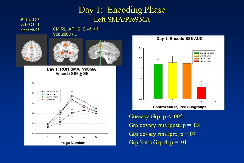 Day 1: Encoding Phase P=1. 5 x 10 -5 vol=371 u. L alpha=0. 05 Left SMA/Pre. SMA CM RL, AP, IS: 0, -6, 46 Vol: 2880 u. L Oneway Grp, p <. 005; Grp covary rms 1 post, p =. 02 Grp covary rms 1 pre, p = 07 Grp 2 vrs Grp 4, p =. 01