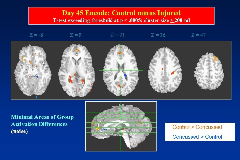 Day 45 Encode: Control minus Injured T-test exceeding threshold at p <. 0005; cluster size > 200 ml Z = -6 Z = 9 L L Minimal Areas of Group Activation Differences (noise) Z = 21 Z = 36 Z = 47 R R • Control > Concussed • Concussed > Control