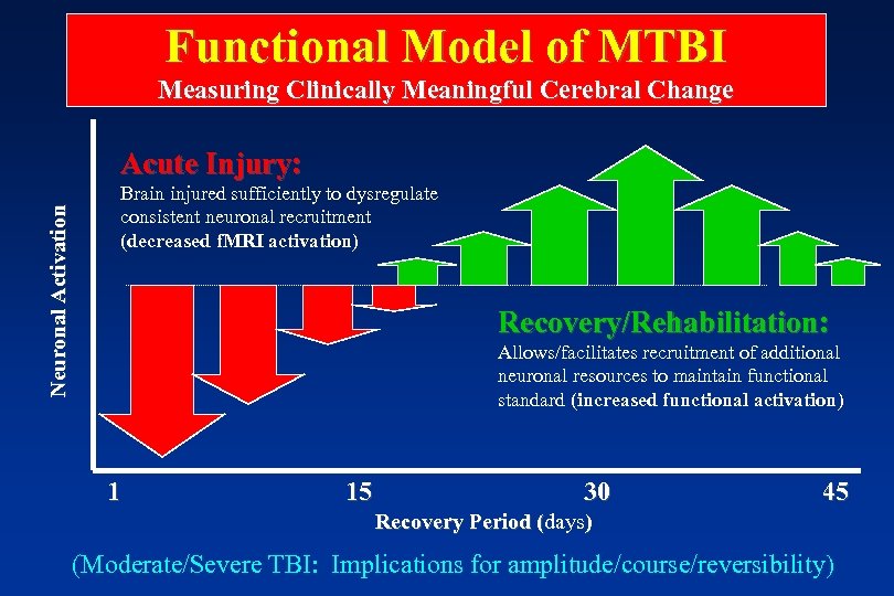 Functional Model of MTBI Measuring Clinically Meaningful Cerebral Change Neuronal Activation Acute Injury: Brain injured sufficiently to dysregulate consistent neuronal recruitment (decreased f. MRI activation) Recovery/Rehabilitation: Allows/facilitates recruitment of additional neuronal resources to maintain functional standard (increased functional activation) 1 15 30 45 Recovery Period (days) ( (Moderate/Severe TBI: Implications for amplitude/course/reversibility)