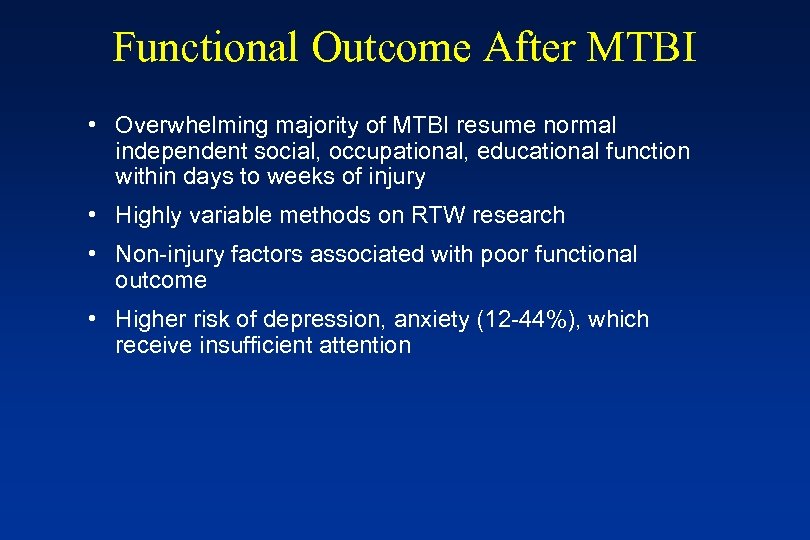 Functional Outcome After MTBI • Overwhelming majority of MTBI resume normal independent social, occupational, educational function within days to weeks of injury • Highly variable methods on RTW research • Non-injury factors associated with poor functional outcome • Higher risk of depression, anxiety (12 -44%), which receive insufficient attention