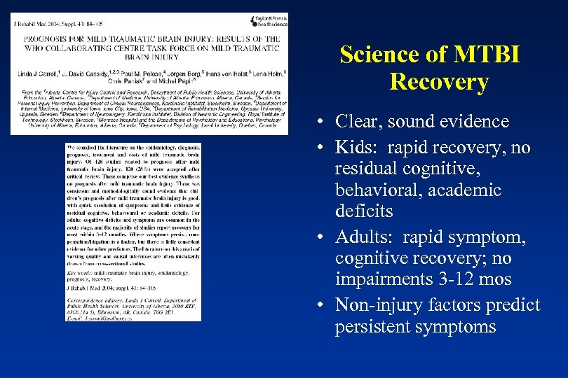 Science of MTBI Recovery • Clear, sound evidence • Kids: rapid recovery, no residual cognitive, behavioral, academic deficits • Adults: rapid symptom, cognitive recovery; no impairments 3 -12 mos • Non-injury factors predict persistent symptoms