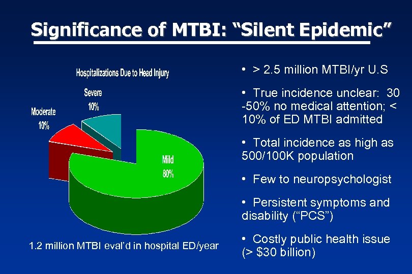 Significance of MTBI: “Silent Epidemic” • > 2. 5 million MTBI/yr U. S • True incidence unclear: 30 -50% no medical attention; < 10% of ED MTBI admitted • Total incidence as high as 500/100 K population • Few to neuropsychologist • Persistent symptoms and disability (“PCS”) 1. 2 million MTBI eval’d in hospital ED/year • Costly public health issue (> $30 billion)
