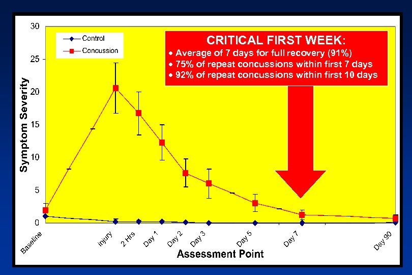 CRITICAL FIRST WEEK: WEEK · Average of 7 days for full recovery (91%) · 75% of repeat concussions within first 7 days · 92% of repeat concussions within first 10 days