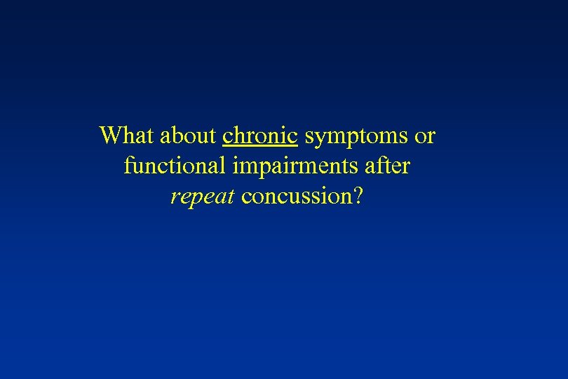 Exceptions to the Rule? • Single, uncomplicated concussion a benign neurologic event, but…. • “Complicated” MTBI • Repeat Concussion: Immediate, mid-range, longterm risks • Second Impact Syndrome: - Mechanism, pathology, risk • Chronic effect on symptoms and cognition • Longterm Effects: What happens when they get old?