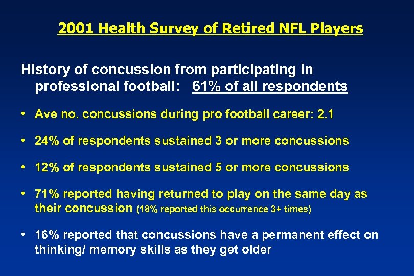 2001 Health Survey of Retired NFL Players History of concussion from participating in professional football: 61% of all respondents • Ave no. concussions during pro football career: 2. 1 • 24% of respondents sustained 3 or more concussions • 12% of respondents sustained 5 or more concussions • 71% reported having returned to play on the same day as their concussion (18% reported this occurrence 3+ times) • 16% reported that concussions have a permanent effect on thinking/ memory skills as they get older