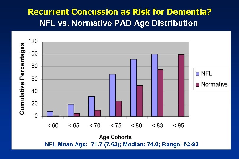 Recurrent Concussion as Risk for Dementia? NFL vs. Normative PAD Age Distribution NFL Mean Age: 71. 7 (7. 62); Median: 74. 0; Range: 52 -83