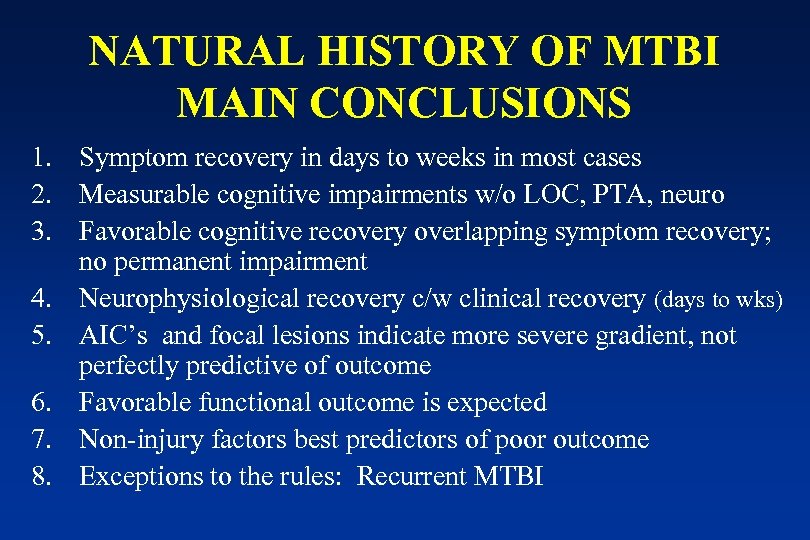 NATURAL HISTORY OF MTBI MAIN CONCLUSIONS 1. Symptom recovery in days to weeks in most cases 2. Measurable cognitive impairments w/o LOC, PTA, neuro 3. Favorable cognitive recovery overlapping symptom recovery; no permanent impairment 4. Neurophysiological recovery c/w clinical recovery (days to wks) 5. AIC’s and focal lesions indicate more severe gradient, not perfectly predictive of outcome 6. Favorable functional outcome is expected 7. Non-injury factors best predictors of poor outcome 8. Exceptions to the rules: Recurrent MTBI