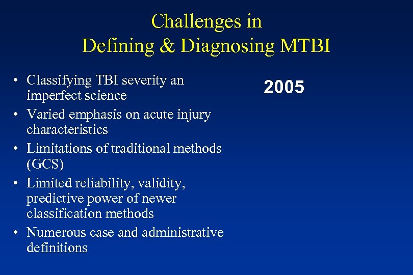 Challenges in Defining & Diagnosing MTBI • Classifying TBI severity an imperfect science • Varied emphasis on acute injury characteristics • Limitations of traditional methods (GCS) • Limited reliability, validity, predictive power of newer classification methods • Numerous case and administrative definitions 2005