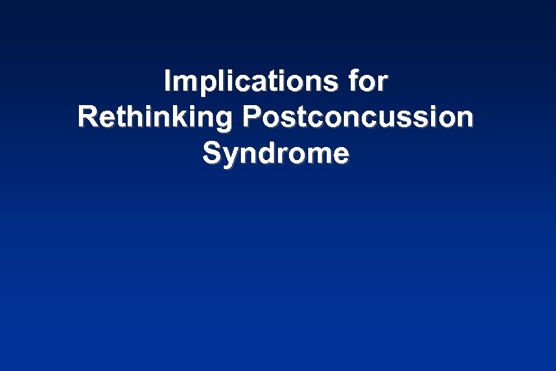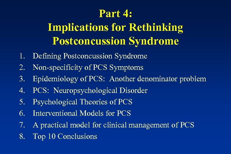 Part 4: Implications for Rethinking Postconcussion Syndrome 1. 2. 3. 4. 5. 6. 7. 8. Defining Postconcussion Syndrome Non-specificity of PCS Symptoms Epidemiology of PCS: Another denominator problem PCS: Neuropsychological Disorder Psychological Theories of PCS Interventional Models for PCS A practical model for clinical management of PCS Top 10 Conclusions