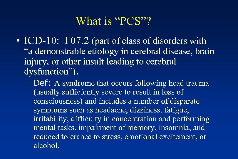 What is “PCS”? • ICD-10: F 07. 2 (part of class of disorders with “a demonstrable etiology in cerebral disease, brain injury, or other insult leading to cerebral dysfunction”). – Def: A syndrome that occurs following head trauma (usually sufficiently severe to result in loss of consciousness) and includes a number of disparate symptoms such as headache, dizziness, fatigue, irritability, difficulty in concentration and performing mental tasks, impairment of memory, insomnia, and reduced tolerance to stress, emotional excitement, or alcohol.