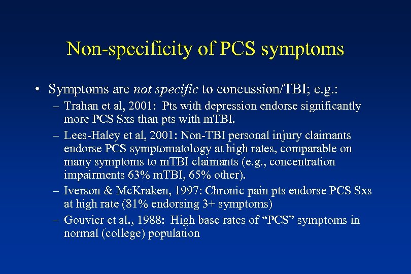 Non-specificity of PCS symptoms • Symptoms are not specific to concussion/TBI; e. g. : – Trahan et al, 2001: Pts with depression endorse significantly more PCS Sxs than pts with m. TBI. – Lees-Haley et al, 2001: Non-TBI personal injury claimants endorse PCS symptomatology at high rates, comparable on many symptoms to m. TBI claimants (e. g. , concentration impairments 63% m. TBI, 65% other). – Iverson & Mc. Kraken, 1997: Chronic pain pts endorse PCS Sxs at high rate (81% endorsing 3+ symptoms) – Gouvier et al. , 1988: High base rates of “PCS” symptoms in normal (college) population