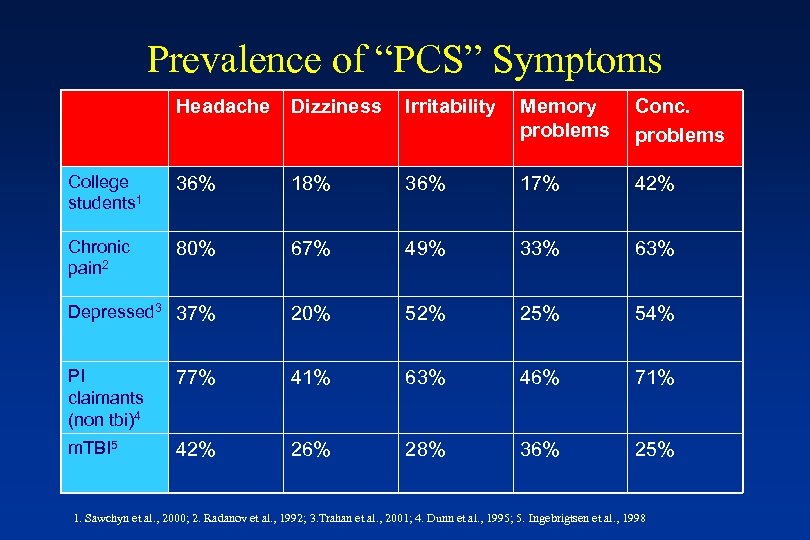 Prevalence of “PCS” Symptoms Headache Dizziness Irritability Memory problems Conc. problems College students 1 36% 18% 36% 17% 42% Chronic pain 2 80% 67% 49% 33% 63% Depressed 3 37% 20% 52% 25% 54% PI claimants (non tbi)4 77% 41% 63% 46% 71% m. TBI 5 42% 26% 28% 36% 25% 1. Sawchyn et al. , 2000; 2. Radanov et al. , 1992; 3. Trahan et al. , 2001; 4. Dunn et al. , 1995; 5. Ingebrigtsen et al. , 1998