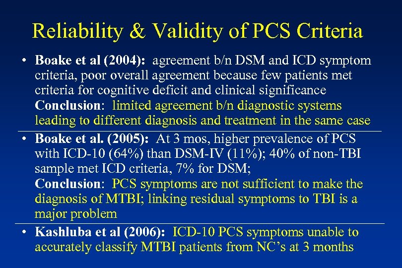 Reliability & Validity of PCS Criteria • Boake et al (2004): agreement b/n DSM and ICD symptom criteria, poor overall agreement because few patients met criteria for cognitive deficit and clinical significance Conclusion: limited agreement b/n diagnostic systems leading to different diagnosis and treatment in the same case • Boake et al. (2005): At 3 mos, higher prevalence of PCS with ICD-10 (64%) than DSM-IV (11%); 40% of non-TBI sample met ICD criteria, 7% for DSM; Conclusion: PCS symptoms are not sufficient to make the diagnosis of MTBI; linking residual symptoms to TBI is a major problem • Kashluba et al (2006): ICD-10 PCS symptoms unable to accurately classify MTBI patients from NC’s at 3 months