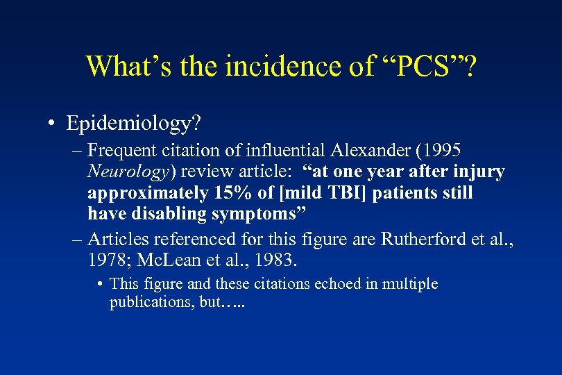 What’s the incidence of “PCS”? • Epidemiology? – Frequent citation of influential Alexander (1995 Neurology) review article: “at one year after injury approximately 15% of [mild TBI] patients still have disabling symptoms” – Articles referenced for this figure are Rutherford et al. , 1978; Mc. Lean et al. , 1983. • This figure and these citations echoed in multiple publications, but…. .