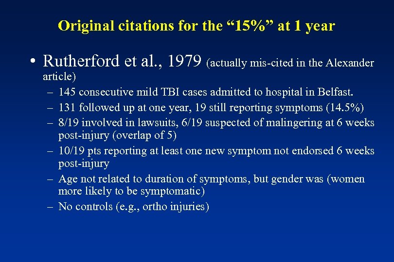 Original citations for the “ 15%” at 1 year • Rutherford et al. , 1979 (actually mis-cited in the Alexander article) – 145 consecutive mild TBI cases admitted to hospital in Belfast. – 131 followed up at one year, 19 still reporting symptoms (14. 5%) – 8/19 involved in lawsuits, 6/19 suspected of malingering at 6 weeks post-injury (overlap of 5) – 10/19 pts reporting at least one new symptom not endorsed 6 weeks post-injury – Age not related to duration of symptoms, but gender was (women more likely to be symptomatic) – No controls (e. g. , ortho injuries)