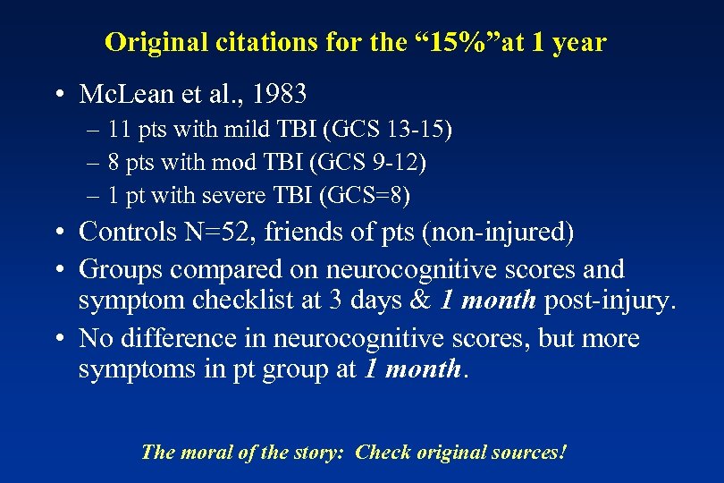 Original citations for the “ 15%”at 1 year • Mc. Lean et al. , 1983 – 11 pts with mild TBI (GCS 13 -15) – 8 pts with mod TBI (GCS 9 -12) – 1 pt with severe TBI (GCS=8) • Controls N=52, friends of pts (non-injured) • Groups compared on neurocognitive scores and symptom checklist at 3 days & 1 month post-injury. • No difference in neurocognitive scores, but more symptoms in pt group at 1 month. The moral of the story: Check original sources!