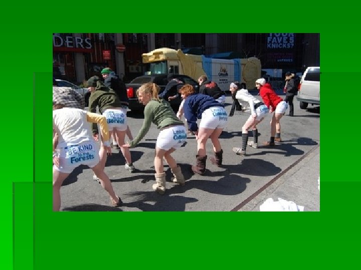 Het toiletpapier veroorzaakt vernietiging van oerbossen. De papierverwerkende gigant die “Kleenex” produceert, lanceerde een publiciteitscampagne van 100 miljoen dollar om het “Cottonelle” toiletpapier te promoten. Milieuactivisten reageerden. Waar de actiebus van “kleenex” verscheen, stonden actievoerders in opvallende broekjes langs de weg.