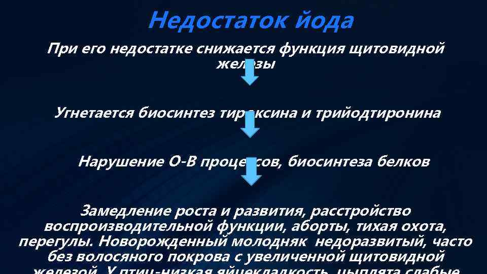 Недостаток йода При его недостатке снижается функция щитовидной железы Угнетается биосинтез тироксина и трийодтиронина Нарушение О-В процессов, биосинтеза белков Замедление роста и развития, расстройство воспроизводительной функции, аборты, тихая охота, перегулы. Новорожденный молодняк недоразвитый, часто без волосяного покрова с увеличенной щитовидной
