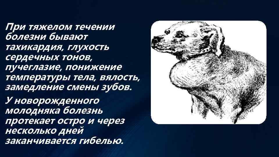 При тяжелом течении болезни бывают тахикардия, глухость сердечных тонов, пучеглазие, понижение температуры тела, вялость, замедление смены зубов. У новорожденного молодняка болезнь протекает остро и через несколько дней заканчивается гибелью.