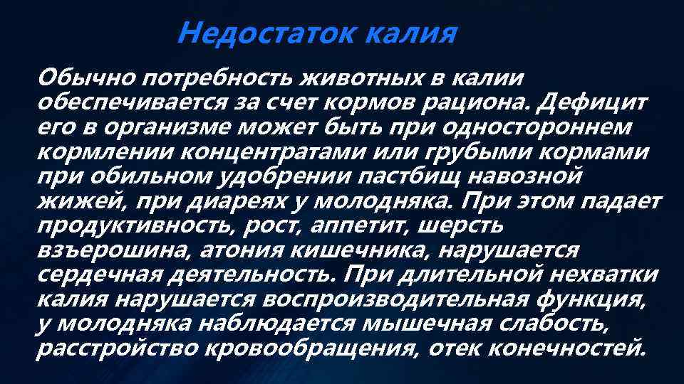 Недостаток калия Обычно потребность животных в калии обеспечивается за счет кормов рациона. Дефицит его в организме может быть при одностороннем кормлении концентратами или грубыми кормами при обильном удобрении пастбищ навозной жижей, при диареях у молодняка. При этом падает продуктивность, рост, аппетит, шерсть взъерошина, атония кишечника, нарушается сердечная деятельность. При длительной нехватки калия нарушается воспроизводительная функция, у молодняка наблюдается мышечная слабость, расстройство кровообращения, отек конечностей.