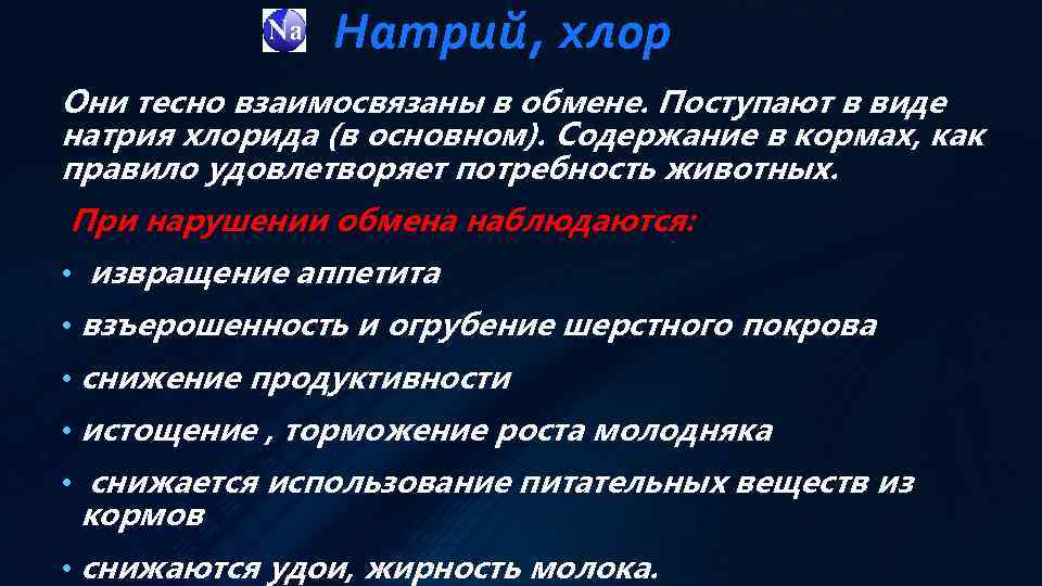 Натрий, хлор Они тесно взаимосвязаны в обмене. Поступают в виде натрия хлорида (в основном). Содержание в кормах, как правило удовлетворяет потребность животных. При нарушении обмена наблюдаются: • извращение аппетита • взъерошенность и огрубение шерстного покрова • снижение продуктивности • истощение , торможение роста молодняка • снижается использование питательных веществ из кормов • снижаются удои, жирность молока.