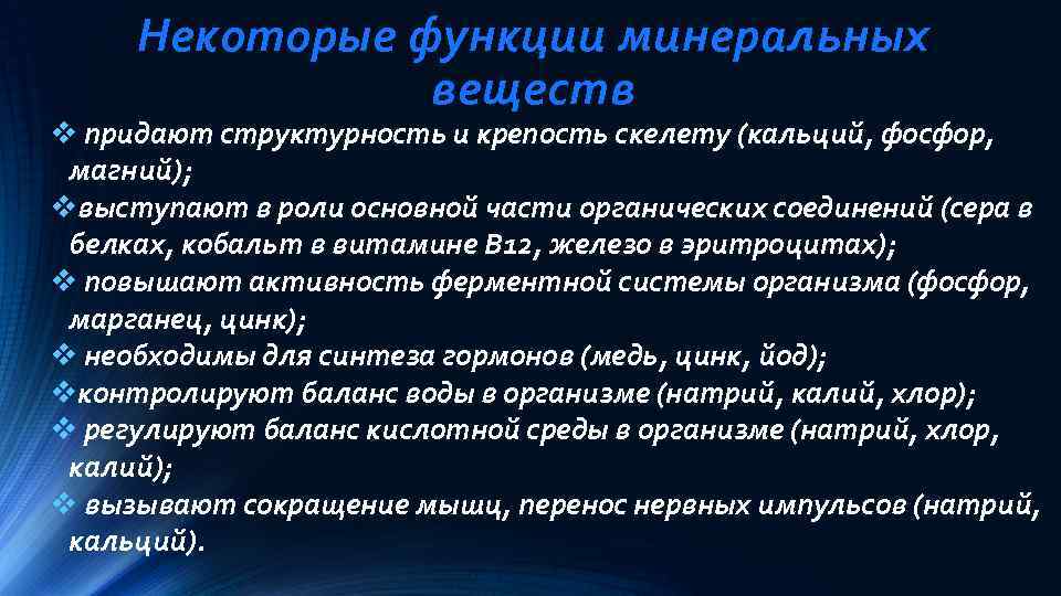 Некоторые функции минеральных веществ v придают структурность и крепость скелету (кальций, фосфор, магний); vвыступают в роли основной части органических соединений (сера в белках, кобальт в витамине В 12, железо в эритроцитах); v повышают активность ферментной системы организма (фосфор, марганец, цинк); v необходимы для синтеза гормонов (медь, цинк, йод); vконтролируют баланс воды в организме (натрий, калий, хлор); v регулируют баланс кислотной среды в организме (натрий, хлор, калий); v вызывают сокращение мышц, перенос нервных импульсов (натрий, кальций).