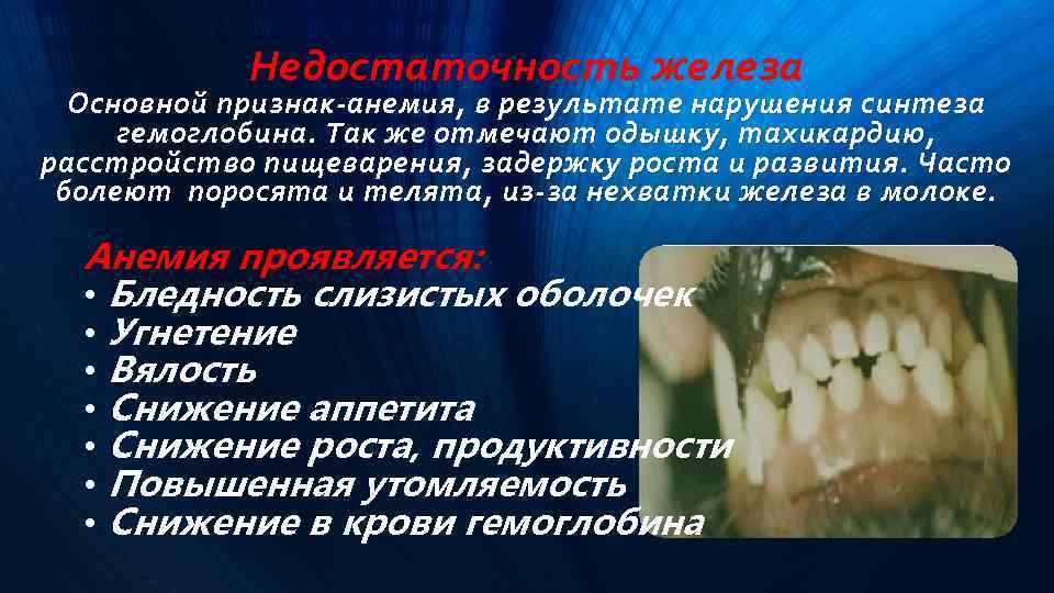 Недостаточность железа Основной признак-анемия, в результате нарушения синтеза гемоглобина. Так же отмечают одышку, тахикардию, расстройство пищеварения, задержку роста и развития. Часто болеют поросята и телята, из-за нехватки железа в молоке. Анемия проявляется: • Бледность слизистых оболочек • Угнетение • Вялость • Снижение аппетита • Снижение роста, продуктивности • Повышенная утомляемость • Снижение в крови гемоглобина