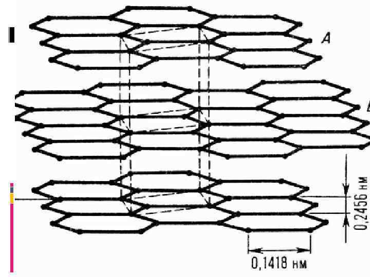 Плоскости, или слои гексагональных циклов, взаимно расположены таким образом, что атом углерода каждого слоя находится против центра шестиугольника соседнего слоя.