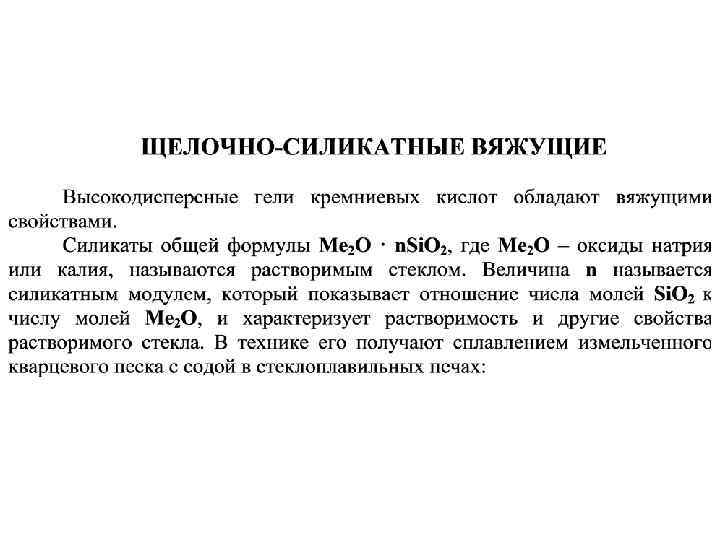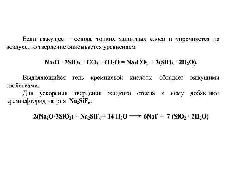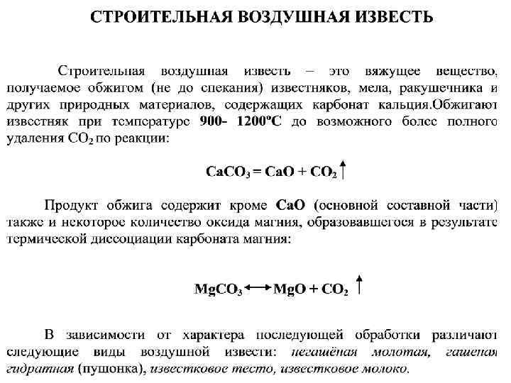 • Воздушные вяжущие вещества после смешивания с водой способны твердеть, длительное время сохранять и повышать свою прочность на воздухе. По химическому составу они делятся на: • гипсовые вяжущие, основой которых является сульфат кальций Ca. SO 4; • магнезиальные вяжущие, содержащие каустический магнезит вяжущие Mg. O; • щелочно-силикатные вяжущие – силикат натрия Na 2 Si. O 3 или калия K 2 Si. O 3 (в виде водного раствора); известковые вяжущие. • Воздушные вяжущие вещества применяют только в надземных сооружениях, не подвергающихся действию воды.