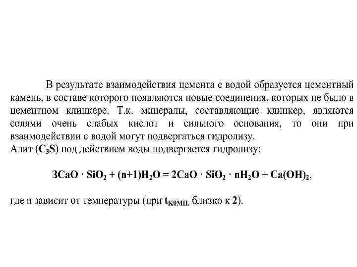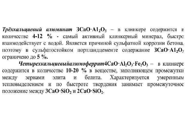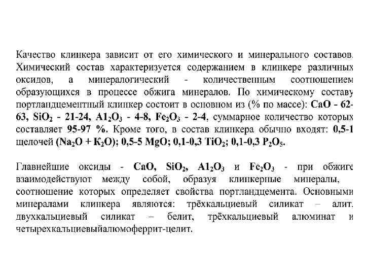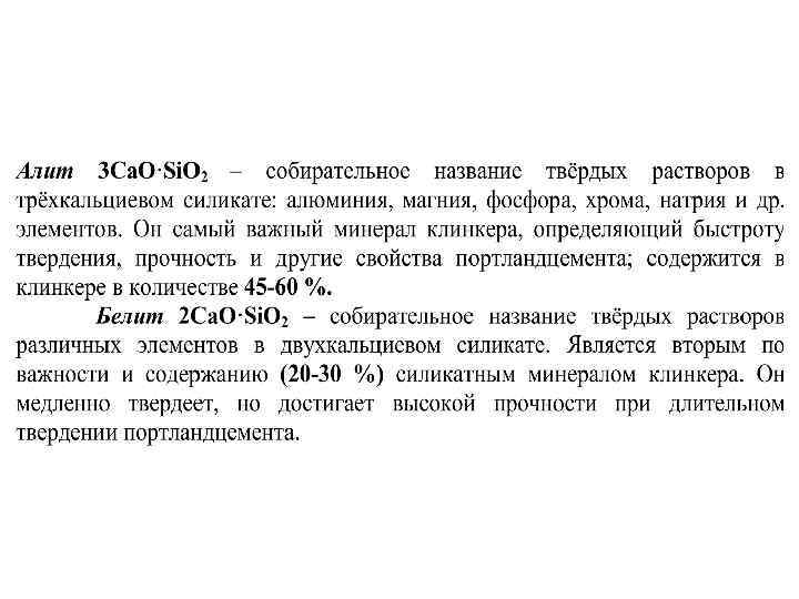 • По вещественнному составу цементы подразделяются на виды: портландцемент; портландцемент с минеральными добавками; шлакопортландцемент и др. • Портландцементом называется гидравлическое вяжущее вещество, твердеющее в воде и на воздухе, получаемое путём совместного размола портландцементного клинкера и гипса, который добавляют для регулирования сроков схватывания. • Клинкер — главный компонент цемента — получают в результате обжига до спекания сырьевой смеси, состоящей из природных горных пород - карбонатных (75 -80 %) и глинистых (20 -25%) - А 12 О 3 · 2 Si. O 2 · Н 2 О - каолинит (основной минерал глин). В качестве сырьевых компонентов применяют также промышленные отходы (нефелиновые шламы, доменные шлаки и др. ), заменяющие глинистую и частично карбонатную или только глинистую составляющую сырьевой смеси. • Изменяя состав клинкера, можно получать цементы с разнообразными физическими и химическими свойствами.