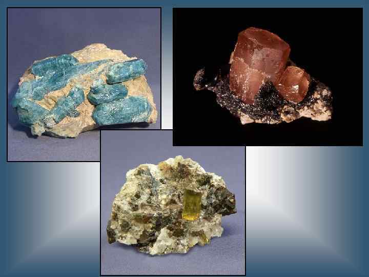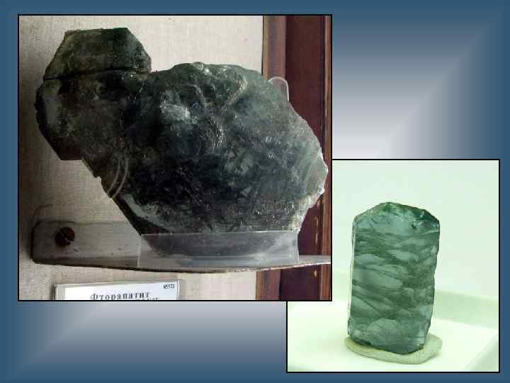апатит Са 5[PO 4]3(F, Cl, ОН) Сингония гексагональная, гексагонально-дипирамидальный вид симметрии Цвет белый, зеленый, сине-зеленый, голубой, фиолетовый, редко красный Цвет черты Белая Блеск Стеклянный до жирного Прозрачность Прозрачный, просвечивающий Твёрдость 5 Спайность несовершенная по (0001) и (1011) Излом раковистый, неровный Плотность 3, 2— 3, 4 г/см³