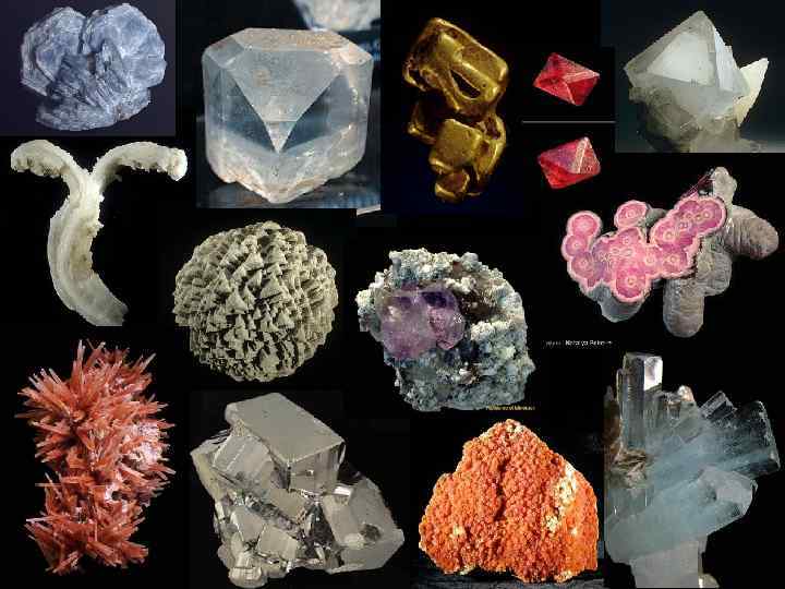 ФОРМЫ МИНЕРАЛЬНЫХ АГРЕГАТОВ Агрегаты – естественные скопления минеральных зерен или кристаллов. Агрегаты: • полиминеральные (состоящие из нескольких различных минералов), • мономинеральные (состоящие из кристаллов одного минерала). Формы агрегатов зависят от химического состава минералов и от условий их образования. В зависимости от условий один и тот же минерал может находиться в разных агрегатах.