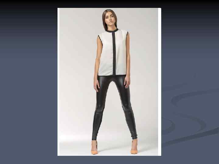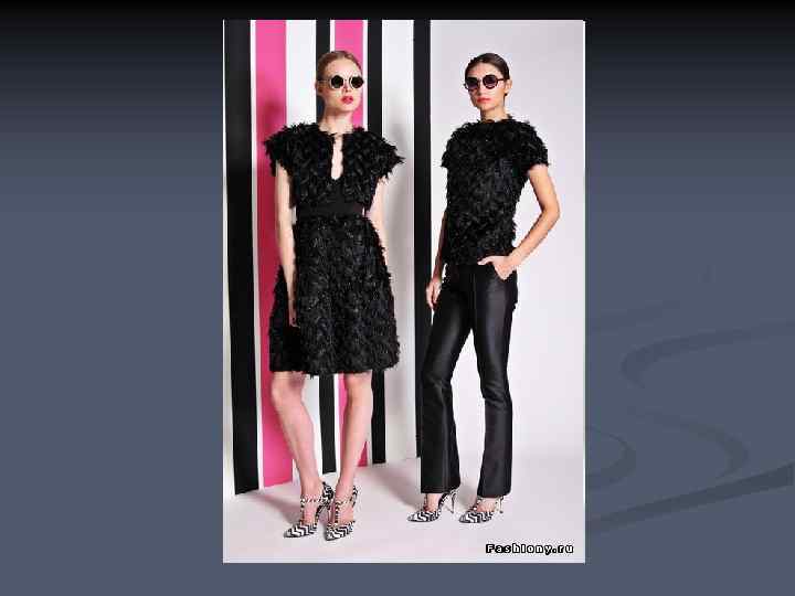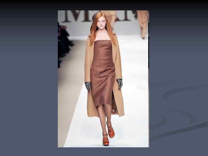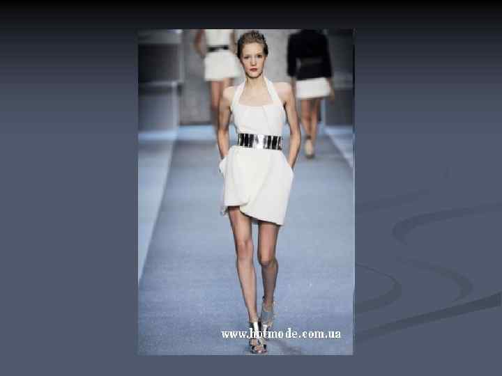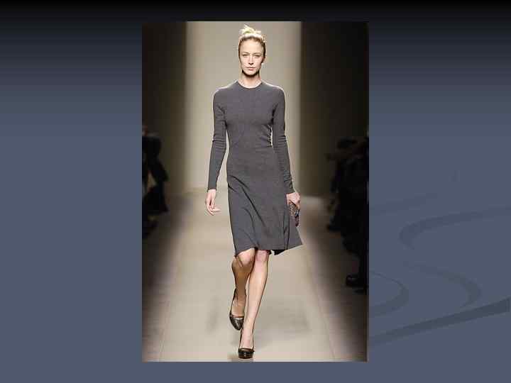 Основные черты n n n минимум деталей, отделок, украшений, меха цвета монохромные или спокойные (чаще всего пастельных оттенков). Используются всего два достаточно спокойных оттенка (красный и серый, тёмный синий и блеклый жёлтый, бежевый и травянисто-зелёный) простые формы, чёткие силуэты, отсутствие видимых застёжек и пуговиц, простой и качественный крой пояса.