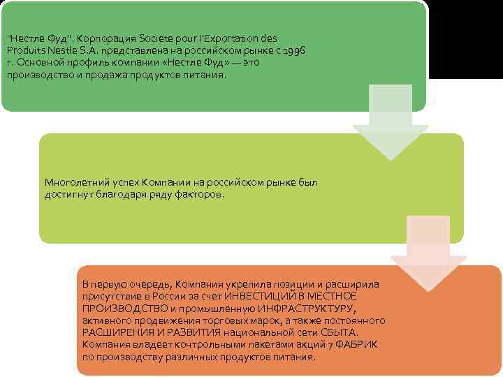 "Нестле Фуд". Корпорация Societe pour I'Exportation des Produits Nestle S. A. представлена на российском рынке с 1996 г. Основной профиль компании «Нестле Фуд» — это производство и продажа продуктов питания. Многолетний успех Компании на российском рынке был достигнут благодаря ряду факторов. В первую очередь, Компания укрепила позиции и расширила присутствие в России за счет ИНВЕСТИЦИЙ В МЕСТНОЕ ПРОИЗВОДСТВО и промышленную ИНФРАСТРУКТУРУ, активного продвижения торговых марок, а также постоянного РАСШИРЕНИЯ И РАЗВИТИЯ национальной сети СБЫТА. Компания владеет контрольными пакетами акций 7 ФАБРИК по производству различных продуктов питания.
