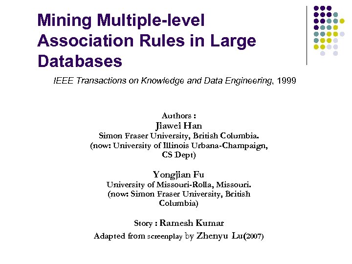 Mining Multiple-level Association Rules in Large Databases IEEE Transactions on Knowledge and Data Engineering, 1999 Authors : Jiawei Han Simon Fraser University, British Columbia. (now: University of Illinois Urbana-Champaign, CS Dept) Yongjian Fu University of Missouri-Rolla, Missouri. (now: Simon Fraser University, British Columbia) Story : Ramesh Kumar Adapted from screenplay by Zhenyu Lu(2007)