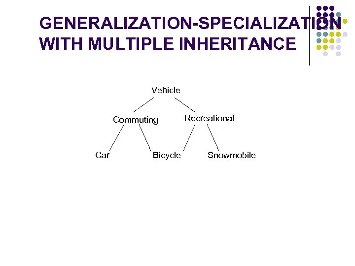 GENERALIZATION-SPECIALIZATION WITH MULTIPLE INHERITANCE Vehicle Commuting Car Bicycle Recreational Snowmobile