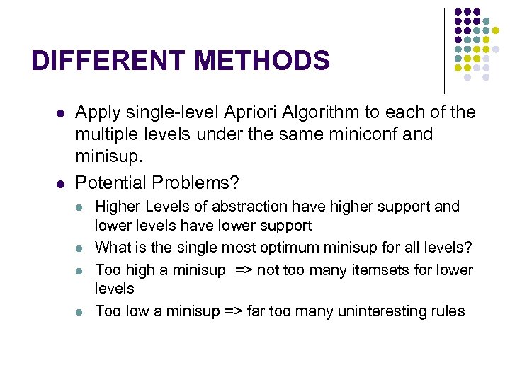 DIFFERENT METHODS l l Apply single-level Apriori Algorithm to each of the multiple levels under the same miniconf and minisup. Potential Problems? l l Higher Levels of abstraction have higher support and lower levels have lower support What is the single most optimum minisup for all levels? Too high a minisup => not too many itemsets for lower levels Too low a minisup => far too many uninteresting rules