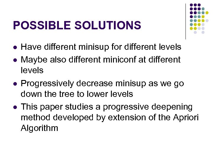 POSSIBLE SOLUTIONS l l Have different minisup for different levels Maybe also different miniconf at different levels Progressively decrease minisup as we go down the tree to lower levels This paper studies a progressive deepening method developed by extension of the Apriori Algorithm