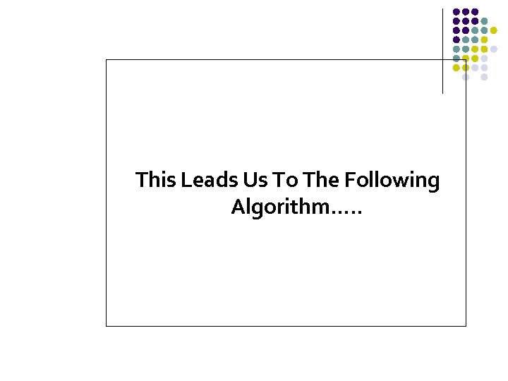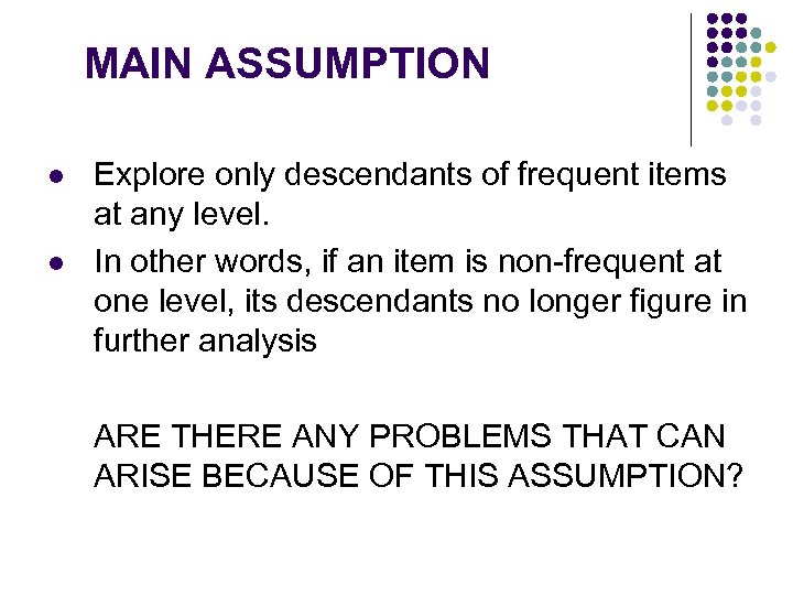 MAIN ASSUMPTION l l Explore only descendants of frequent items at any level. In other words, if an item is non-frequent at one level, its descendants no longer figure in further analysis ARE THERE ANY PROBLEMS THAT CAN ARISE BECAUSE OF THIS ASSUMPTION?