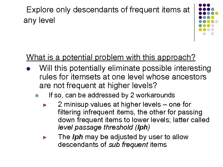 Explore only descendants of frequent items at any level What is a potential problem with this approach? l Will this potentially eliminate possible interesting rules for itemsets at one level whose ancestors are not frequent at higher levels? ® If so, can be addressed by 2 workarounds 2 minisup values at higher levels – one for filtering infrequent items, the other for passing down frequent items to lower levels; latter called level passage threshold (lph) The lph may be adjusted by user to allow descendants of sub frequent items