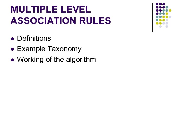MULTIPLE LEVEL ASSOCIATION RULES l l l Definitions Example Taxonomy Working of the algorithm