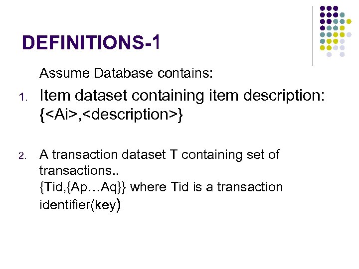 DEFINITIONS-1 Assume Database contains: 1. Item dataset containing item description: {<Ai>, <description>} 2. A transaction dataset T containing set of transactions. . {Tid, {Ap…Aq}} where Tid is a transaction identifier(key)