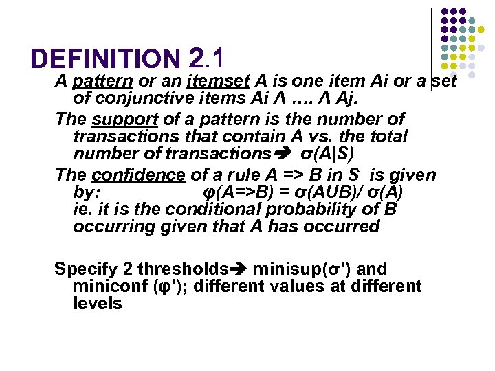 DEFINITION 2. 1 A pattern or an itemset A is one item Ai or a set of conjunctive items Ai Λ …. Λ Aj. The support of a pattern is the number of transactions that contain A vs. the total number of transactions σ(A|S) The confidence of a rule A => B in S is given by: φ(A=>B) = σ(AUB)/ σ(A) ie. it is the conditional probability of B occurring given that A has occurred Specify 2 thresholds minisup(σ’) and miniconf (φ’); different values at different levels