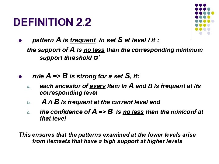 DEFINITION 2. 2 pattern A is frequent in set S at level l if : l the support of A is no less than the corresponding minimum support threshold σ’ rule A => B is strong for a set S, if: l a. b. c. each ancestor of every item in A and B is frequent at its corresponding level A Λ B is frequent at the current level and the confidence of A => B is no less than the miniconf at that level This ensures that the patterns examined at the lower levels arise from itemsets that have a high support at higher levels