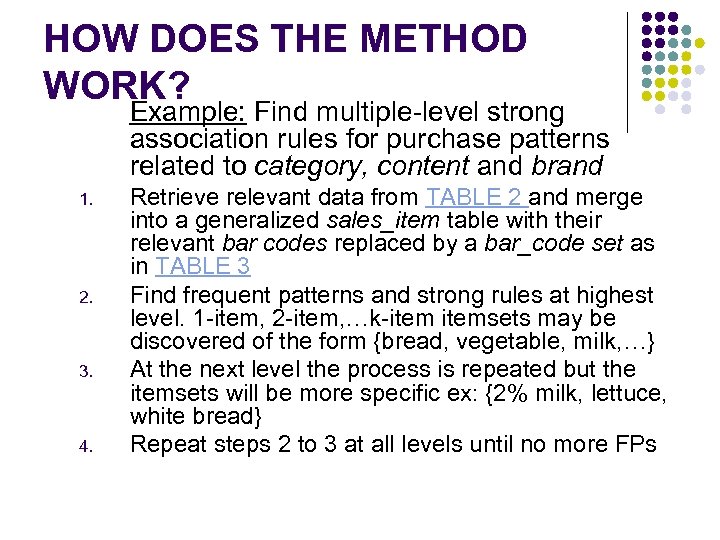 HOW DOES THE METHOD WORK? Example: Find multiple-level strong association rules for purchase patterns related to category, content and brand 1. 2. 3. 4. Retrieve relevant data from TABLE 2 and merge into a generalized sales_item table with their relevant bar codes replaced by a bar_code set as in TABLE 3 Find frequent patterns and strong rules at highest level. 1 -item, 2 -item, …k-itemsets may be discovered of the form {bread, vegetable, milk, …} At the next level the process is repeated but the itemsets will be more specific ex: {2% milk, lettuce, white bread} Repeat steps 2 to 3 at all levels until no more FPs