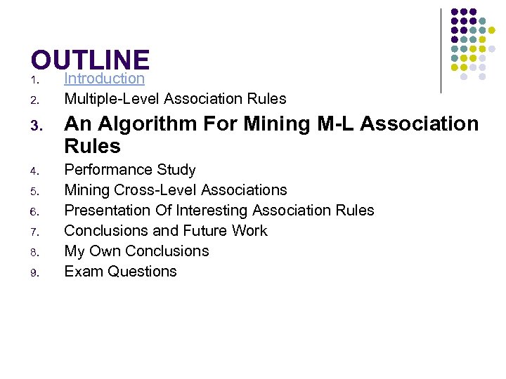 OUTLINE 1. 2. 3. 4. 5. 6. 7. 8. Introduction Multiple-Level Association Rules A Method For Mining M-L Association Rules Performance Study Mining Cross-Level Associations Interesting Association Rules Conclusions and Future Work Exam Questions