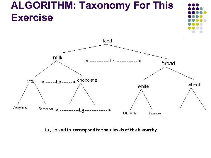 ALGORITHM: Taxonomy For This Exercise food milk 2% Dairyland < ------ L 1 ------ > < ------L 2 ------ > chocolate Foremost < ------L 3 ------- > bread wheat white Old Mills Wonder L 1, L 2 and L 3 correspond to the 3 levels of the hierarchy